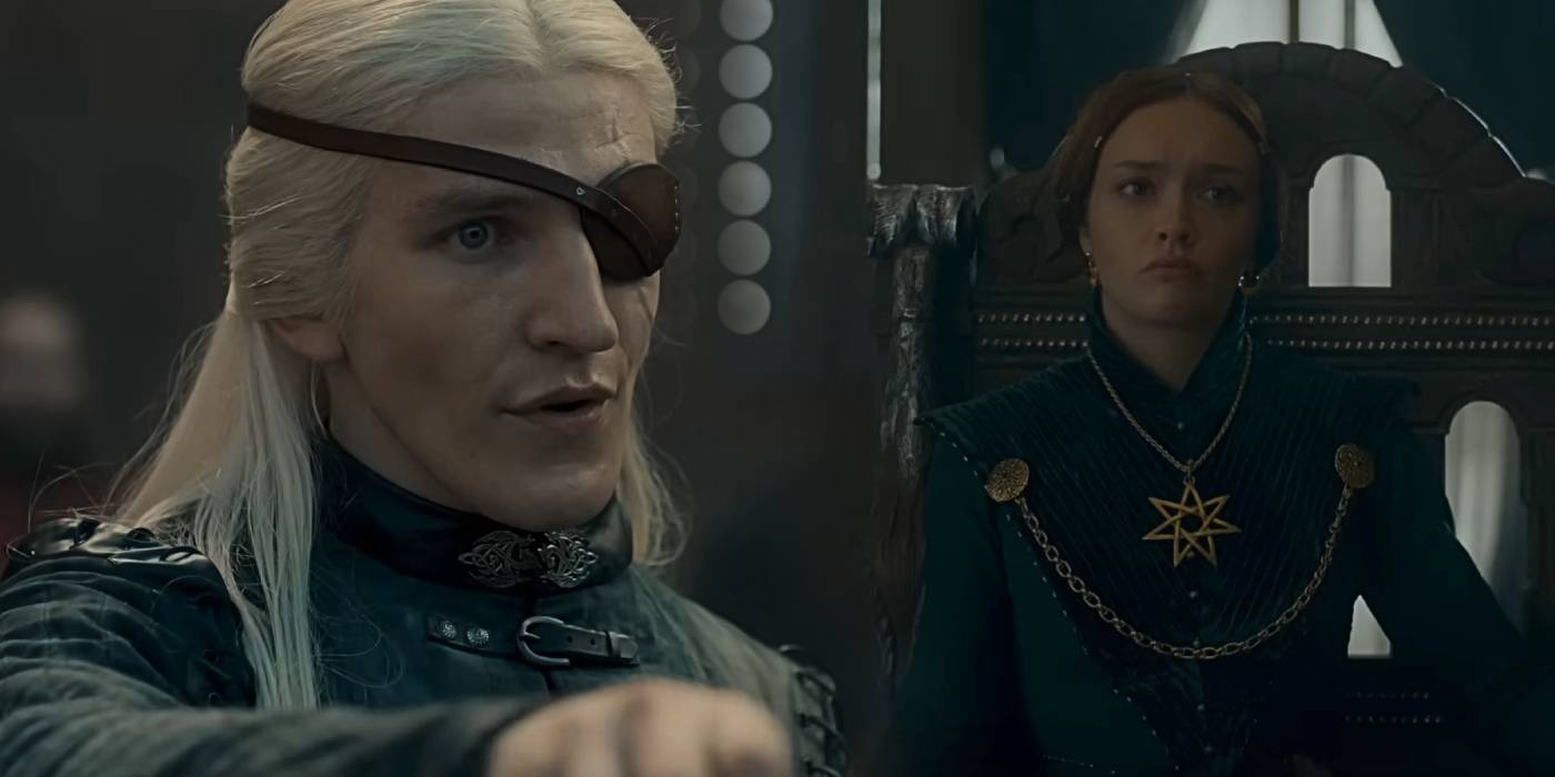 House of the Dragon episode 7 finds the royal families together at Driftmark to bury Lady Laena Velaryon (Nanna Blondell) at sea. Tensions rise as Prince Daemon Targaryen (Matt Smith) and Princess Rhaenyra Targaryen (Emma D’Arcy) are brought together sparking deeply-rooted romantic emotions while questions of her children’s legitimacy bubble to the surface in front of the king. Following the service, Prince Aemond Targaryen (Leo Ashton) sneaks out in the middle of the night and bonds with the dragon Vhagar. This leads Laena’s daughters to confront Aemond who violently defends himself. In the scuffle, Prince Lucerys Velaryon (Harvey Sadler) cuts his eye with a dagger, igniting a confrontation between Queen Alicent Hightower (Olivia Cooke) and Rhaenyra that leaves them on a course to an inevitable war.
